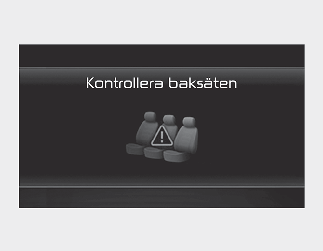 Varningsmeddelandet ”Kontrollera baksäten” (Kontrollera baksätena) kommer att visas på instrumenteringen när du öppnar framdörren efter att bakdörren öppnats och stängts och motorn stängts av.