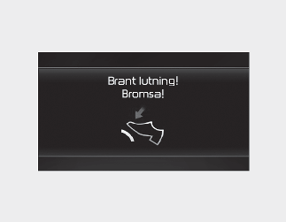 Det här varningsmeddelandet visas när fordonet körs långsamt i en lutning och fordonet detekterar att bromspedalen inte används.