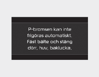 Om det är något fel på bilen kan en varningssignal höras (en gång) och ett meddelande visas. Om situationen ovan uppstår ska du trycka ner bromspedalen och frigöra EPB genom att trycka på EPB-knappen.