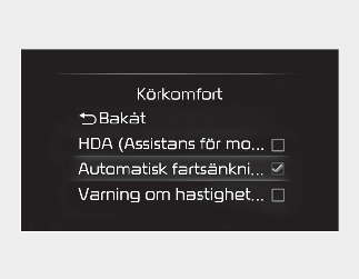 Med ENGINE START/STOP-knappen i On-läge, välj "Användarinställningar → Förarassistans → Körkomfort" i infotainmentsystemet för att ställa in om varje funktion ska användas.