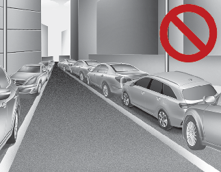 När du ska köra ut från en smal parkeringsplats nära en vägg är det inte säkert att funktionen fungerar. Om du ska lämna en parkeringsplats liknande den som visas ovan måste du se upp för hinder när du kör ut.