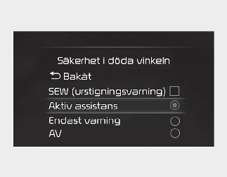 Om du väljer ’Off’ (av) stängs Assistans för Undvikande Död-Vinkel-Kollision av.