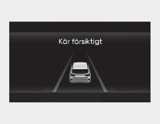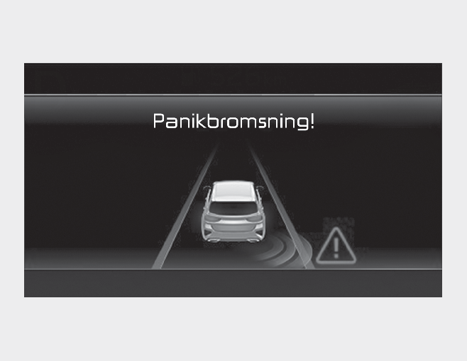 Varningsmeddelandet "Kör försiktigt" visas i klustret när systemet panikbromsar fordonet.
