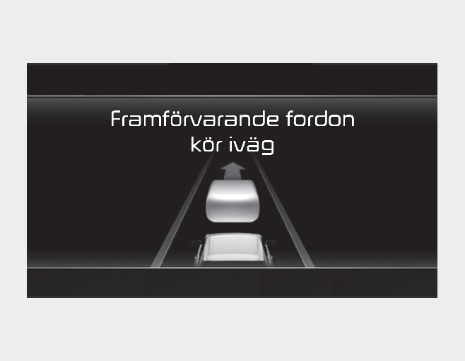 Varningen “Framförvarande fordon startar” informerar föraren när framförvarande fordon börjar köra. Systemet visar meddelandet “Framförvarande fordon börjar köra” samtidigt som en hörbar varning ljuder.