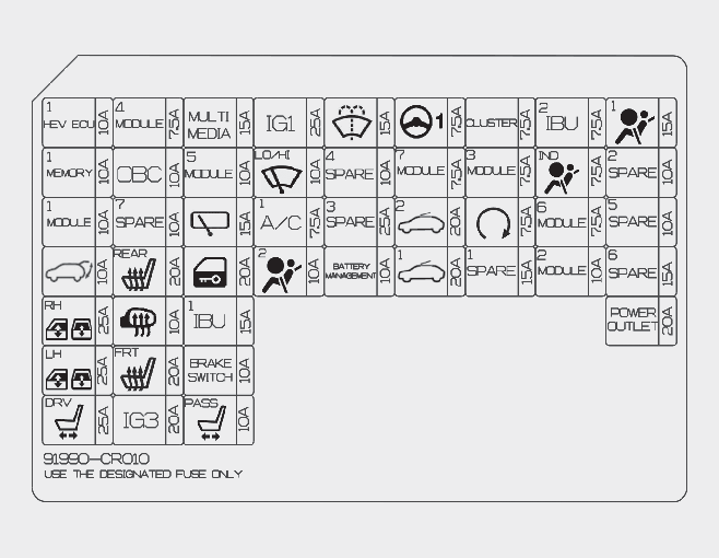 ICU-kopplingsdosa (Säkringsnamn: BAKLUCKA, FÖNSTERHISS HÖGER, FÖNSTERHISS HÖGER,ELMANÖVRERAT FÖRARSÄTE, FRAMSÄTESVÄRME, IG3, ELMANÖVRERAT PASSAGERARSÄTE, MDPS (servostyrning), SOLTAK 2, SOLTAK 1) |