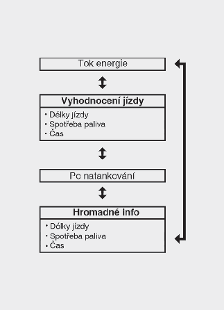 V tomto zobrazení je uvedená délka jízdy, průměrná a momentální spotřeba paliva (nebo celková doba jízdy) od doplnění paliva.