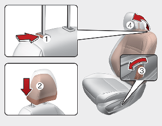 To lower the headrest, push and hold the release button (2) on the headrest support.