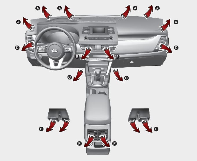 Most of the air flow is directed to the floor, with a small amount of the air being directed to the windshield, side window defrosters and side air vents.