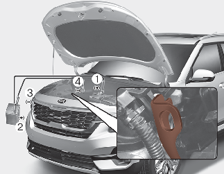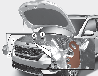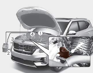Proceed to connect one end of the other jumper cable to the negative terminal of the booster battery (3), then the other end to a solid, stationary, metallic point (for example, the engine lifting bracket) away from the battery (4). Do not connect it to or near any part that moves when the engine is cranked.