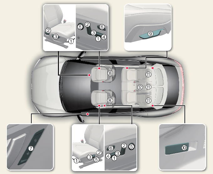 * Выше показано изображение для автомобилей с левосторонним управлением. В автомобилях с правосторонним рулем органы управления передним сиденьем расположены на противоположной стороне.