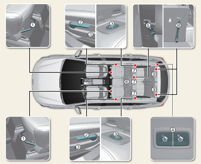 * Pro vozidlo se 6 sedadly není v zadní 2. řadě žádné prostřední sedadlo.