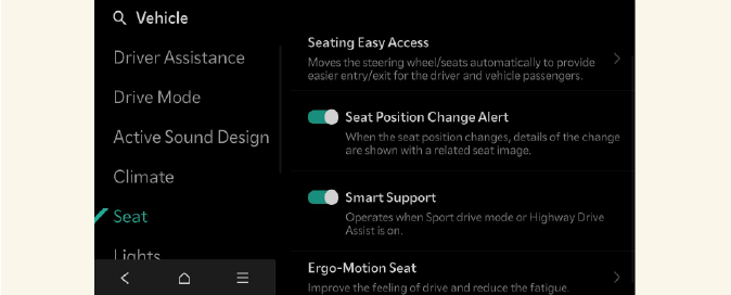 Inteligentní podpora: Podložka sedadla řidiče se zvětší při volbě režimu SPORT nebo při jízdě vysokou rychlostí.
