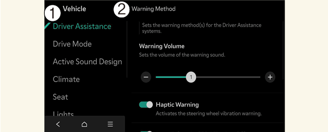 Způsoby varování lze nastavit, když je vozidlo zapnuté. Volbou možnosti Nastavení → Vozidlo → Jízdní asistent → Způsoby varování z nabídky Nastavení v informačním systému změníte následující nastavení: