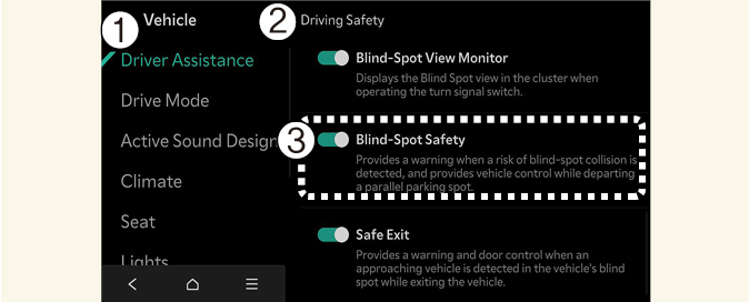Je-li zrušena volba Blind-Spot Safety (Detekce mrtvého úhlu), měl by řidič neustále věnovat pozornost okolí a řídit bezpečně.