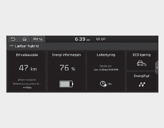 Plug-in-hybrid-menyen består av fem deler: [EV range] (Elbildistanse), [Energy information] (Energiinformasjon), [Charge management] (Ladebehandling) , [ECO driving] (Økonomisk kjøring), [Energy flow] (Energiflyt).