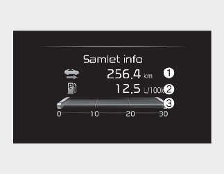 Dette displayet viser turlengde (1), gjennomsnittlig drivstofforbruk (2) og drivstofføkonomi i øyeblikket (3), total kjøretid (4) informasjon for hver tenningssyklus.