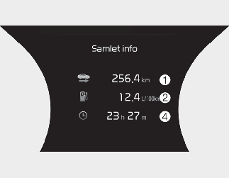Dette displayet viser akkumulert turlengde (1), gjennomsnittlig drivstofforbruk (2) og drivstofføkonomi i øyeblikket (3), og total kjøretid (4).
