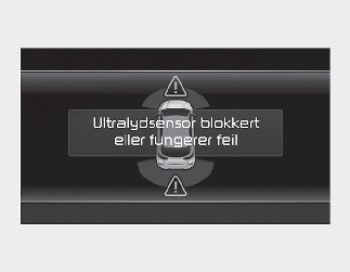 Varselmeldingen ‘Ultrasonic sensor error or blockage’ (Ultralydsensor blokkert eller fungerer feil) vises på instrumentpanelet.