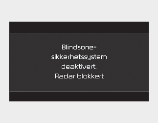 Når støtfangeren rundt den bakre hjørneradaren eller sensoren er tildekket av fremmedlegemer, f.eks. snø eller regn, eller det er montert tilhenger eller stativ, kan dette redusere registreringsevnen og midlertidig begrense eller deaktivere systemet for varsel om sikker utgang. Hvis dette skjer, vises varselmeldingen 'System for blindsonesikkerhet deaktivert. Radar blokkert’ varselmelding vil vises på instrumentpanelet. Varselet om sikker utgang vil fungere på riktig måte når fremmedlegemer, tilhenger osv. fjernes, og du deretter starter motoren på nytt.