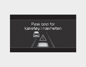 I følgende situasjon vil varselmelding 'Vær oppmerksom på kjøretøy i nærheten' vises på instrumentpanelet og et lydvarsel vil høres for å varsle føreren om veiforhold foran.