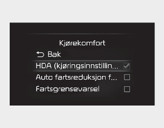 Med ENGINE START/STOP (Start/Stopp-knappen) i On, posisjon, velg "Brukerinnstillinger → Førerassistanse → Førerens komfort" på LCD-displayet eller Infotainmentsystemet for å velge hvorvidt hver funksjon skal brukes.