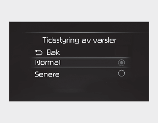Velg "Late" (Senere) for varseltid i lett trafikk og lav kjørehastighet.