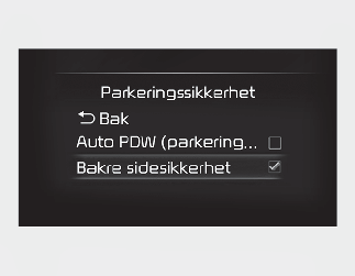 Med ENGINE START/STOP (Start/Stopp-knappen) i On, posisjon, velg "Brukerinnstillinger → Førerassistanse → Parkeringssikkerhet" på LCD-displayet eller Infotainmentsystemet for å velge hvorvidt hver funksjon skal brukes.