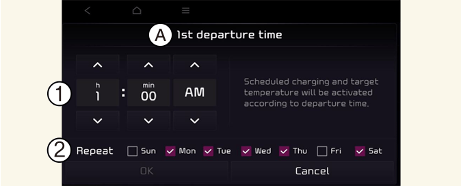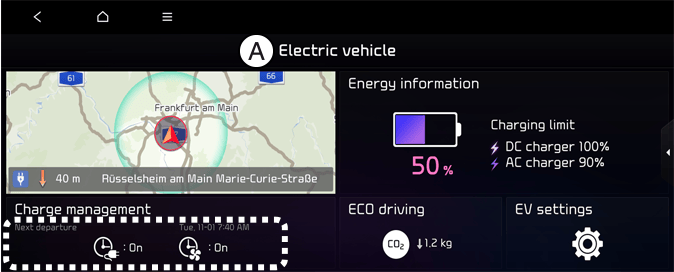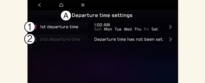 حدد EV → Next departure (المغادرة التالية) من الشاشة. يمكنك ضبط تاريخ ووقت شحن البطارية، ودرجة حرارة التحكم في المناخ، والوظائف المختلفة الأخرى.