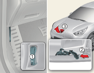 افتح الغطاء بعد إيقاف تشغيل المحرك على سطح أملس، وتحريك الغطاء إلى وضع P (Park) (إيقاف) وضبط فرامل الانتظار.
