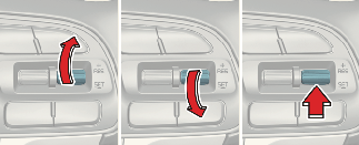 اسحب المفتاح (إلى RES+) أو اضغط عليه (إلى SET-) وحرره عند الوصول للسرعة المطلوبة. اسحب المفتاح (إلى RES+) أو اضغط عليه (إلى SET-) مع الاستمرار. ستزداد السرعة أو تقل بمعدل 5 كم/ساعة (3 أميال/ساعة).