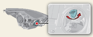 انزع غطاء الغبار (A) من مجموعة المصابيح الأمامية ثم مقبس اللمبة عن طريق إدارته عكس اتجاه عقارب الساعة حتى تتم محاذاة الألسنة على مقبس اللمبة مع الفتحات على مجموعة المصابيح الأمامية.