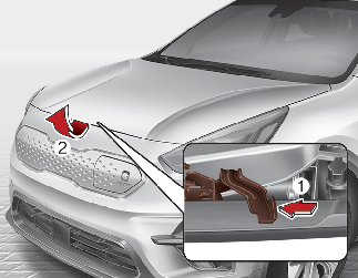 Go to the front of the vehicle, raise the hood slightly, push the secondary latch (1) up side and lift the hood (2).