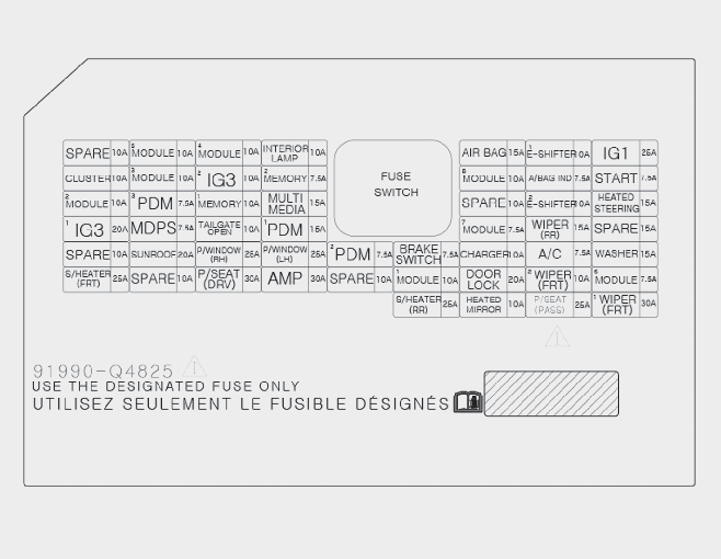 IGPM (Fuse - Tail Gate, Sunroof, P/window RH, P/window LH. S/Heater (FRT), P/Seat (DRV), AMP, IG3_1, CHARGER |