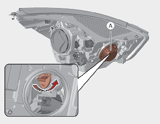 Remove the dust cover (A) from the headlamp assembly then the bulb-socket by turning it counterclockwise until the tabs on