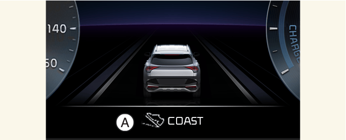 Un carillon retentira et l’indicateur de guidage en roue libre s’affichera pour informer le conducteur du moment où il doit lever le pied de l’accélérateur en anticipant un événement de décélération* sur la base de l’analyse des itinéraires et des conditions routières stockés dans le système de navigation. Il incite le conducteur à retirer le pied de la pédale et permet de rouler au point mort uniquement avec le moteur électrique (EV). Cela permet d’éviter toute consommation inutile de carburant et d’augmenter le rendement énergétique.