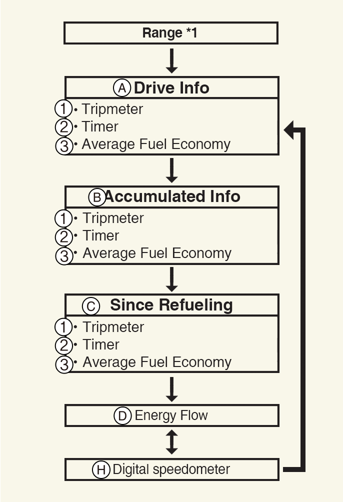 Cet affichage affiche la distance parcourue, le rendement énergétique moyen et le rendement énergétique instantané (ou la durée totale de conduite) depuis le ravitaillement.