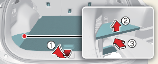 Ouvrez la planche à bagages (1) et le couvercle du plateau latéral (2) et gardez l’écran de sécurité du chargement dans le plateau (3) (si le moteur à essence et la mini roue de secours temporaire sont équipés dans les bagages).