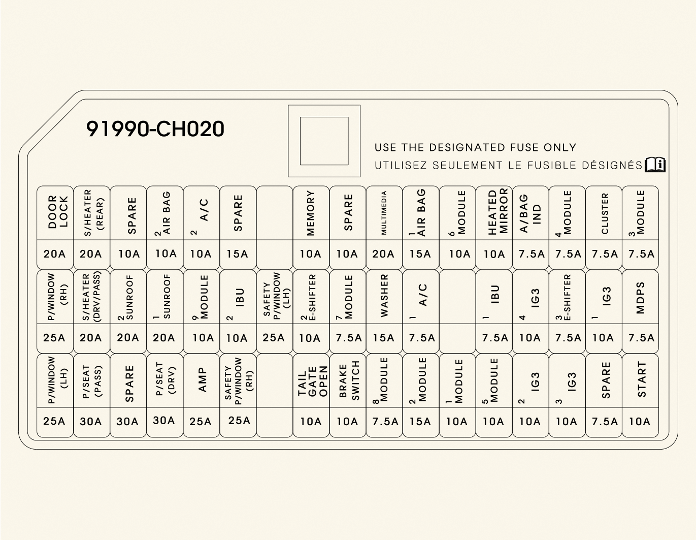 À l’intérieur du couvercle du panneau de fusibles/relais, vous trouverez l’étiquette des fusibles/relais avec le nom des fusibles/relais et leur capacité.