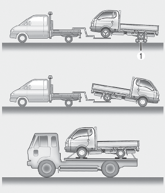 En caso de tener que remolcar el vehículo, recomendamos que lo solicite a un taller Kia autorizado o a un servicio comercial de grúas. Para evitar daños, es necesario llevar a cabo correctamente los procedimientos de elevación y remolque del vehículo. Se recomienda utilizar una plataforma rodante (1) o plana.