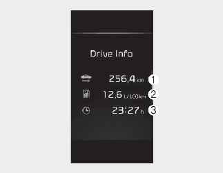 This display shows the trip distance (1), the average fuel efficiency (2), and the total driving time (3) information once per one ignition cycle.