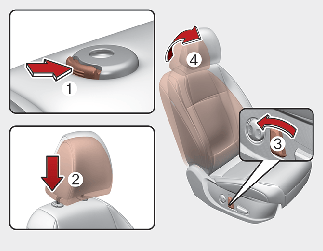 To lower the headrest, push and hold the release button (2) on the headrest support.