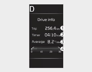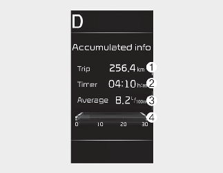 This display shows the trip distance (1), the total driving time (2), the average fuel efficiency (3), and the instant fuel economy (4, if equipped) information once per one ignition cycle.