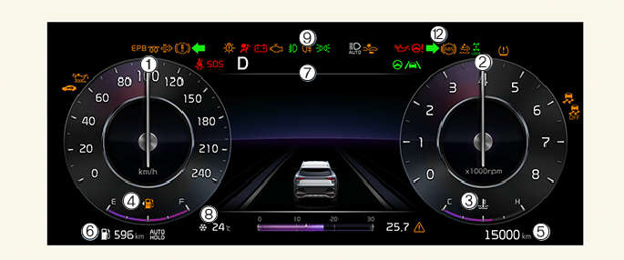 В случае когда приборная панель является ЖК-дисплеем (тип B), информация отображается после того, как будет получена от системы передачи сведений о погоде через GPS. В зависимости от условий приема GPS, полученная информация может отличаться от погоды в данный момент в вашем регионе. Если информация не получена через GPS (например, не оформлена подписка на услугу Kia Connect), погода и время будут отображаться на панели как «ясная» и «ночь».