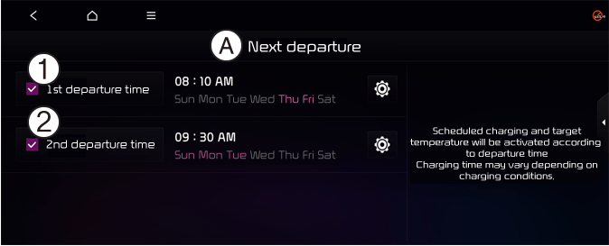 Selecione EV → Próxima partida no ecrã. Pode definir a data e a hora para carregar a bateria, a temperatura da climatização e outras funções.