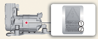 A etiqueta do compressor informa-o sobre o tipo de compressor com que o seu veículo está equipado, nomeadamente o modelo, o número da peça sobresselente, o número de produção, o fluido refrigerante (1) e o óleo de refrigeração (2).