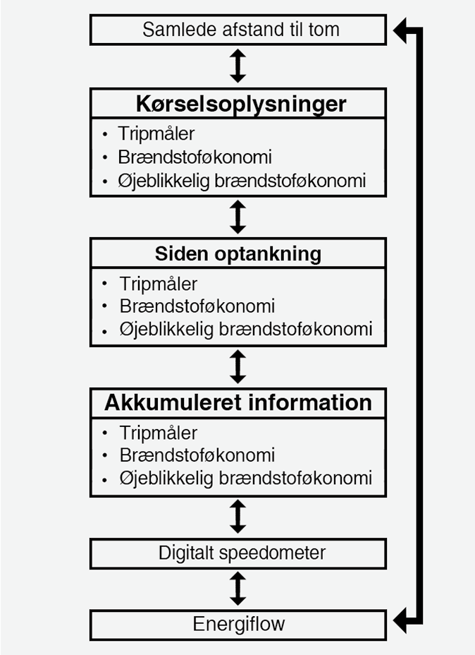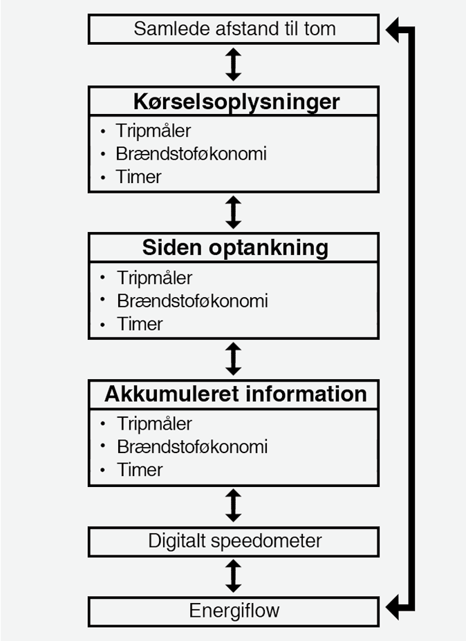 Dette display viser tripafstand (1), den gennemsnitlige brændstofeffektivitet (2) og den øjeblikkelige brændstoføkonomi (3) og den samlede information om køretid (4) en gang pr. tændingscyklus.