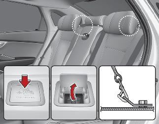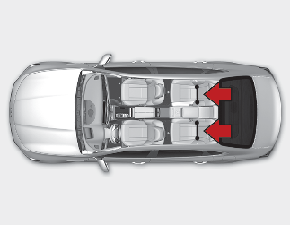 어린이 보조좌석을 고정할 수 있는 상부 부착구(후크 고정용)가 뒷좌석 선반에 위치해 있습니다.