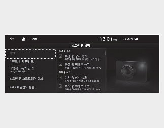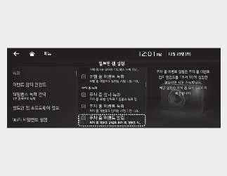 인포테인먼트 시스템 홈 화면에서 빌트인 캠을 선택한 후, '빌트인 캠 설정 → ‘녹화’를 차례로 선택하십시오. 주행 및 주차 시 녹화 방법을 선택할 수 있습니다.