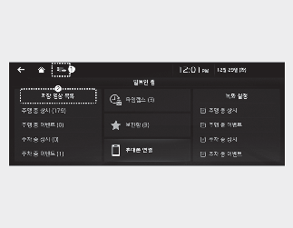 카테고리 별 상태 확인(Wi-Fi(와이파이) 동글 및 USB 메모리 연결 상태 표시, 전후방 카메라 상태 표시, 보조 배터리 상태 표시)