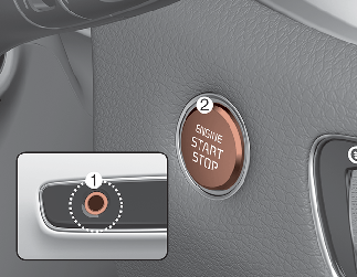 지문 인식 센서(1)에 손가락을 올려 지문 인증을 성공한 후 30초 안에 시동 버튼(2)을 눌러 시동을 거십시오.